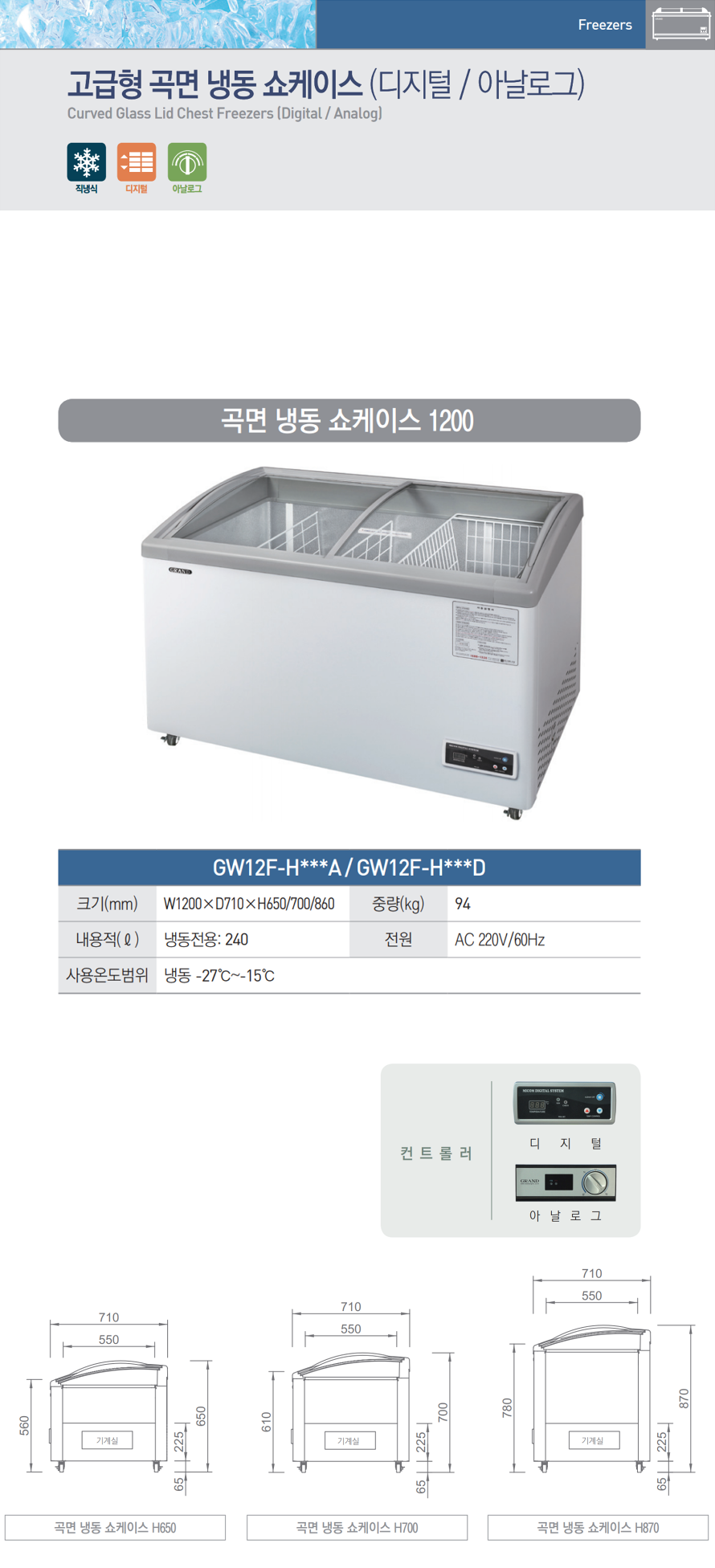 우성 고급형 곡면 냉동 쇼케이스 아이스크림 냉장고 1200x710x700 GW12F-H700A GW12F-H700D