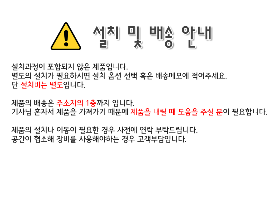 - 전문기사 설치가 필요한 제품은 설치 배송이 진행되며, 배송 전 반드시 주소지/진입조건 확인이 필요합니다.