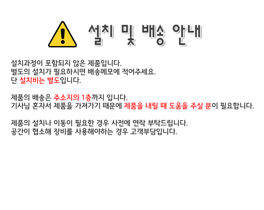 - 전문기사 설치가 필요한 제품은 설치 배송이 진행되며, 배송 전 반드시 주소지/진입조건 확인이 필요합니다.