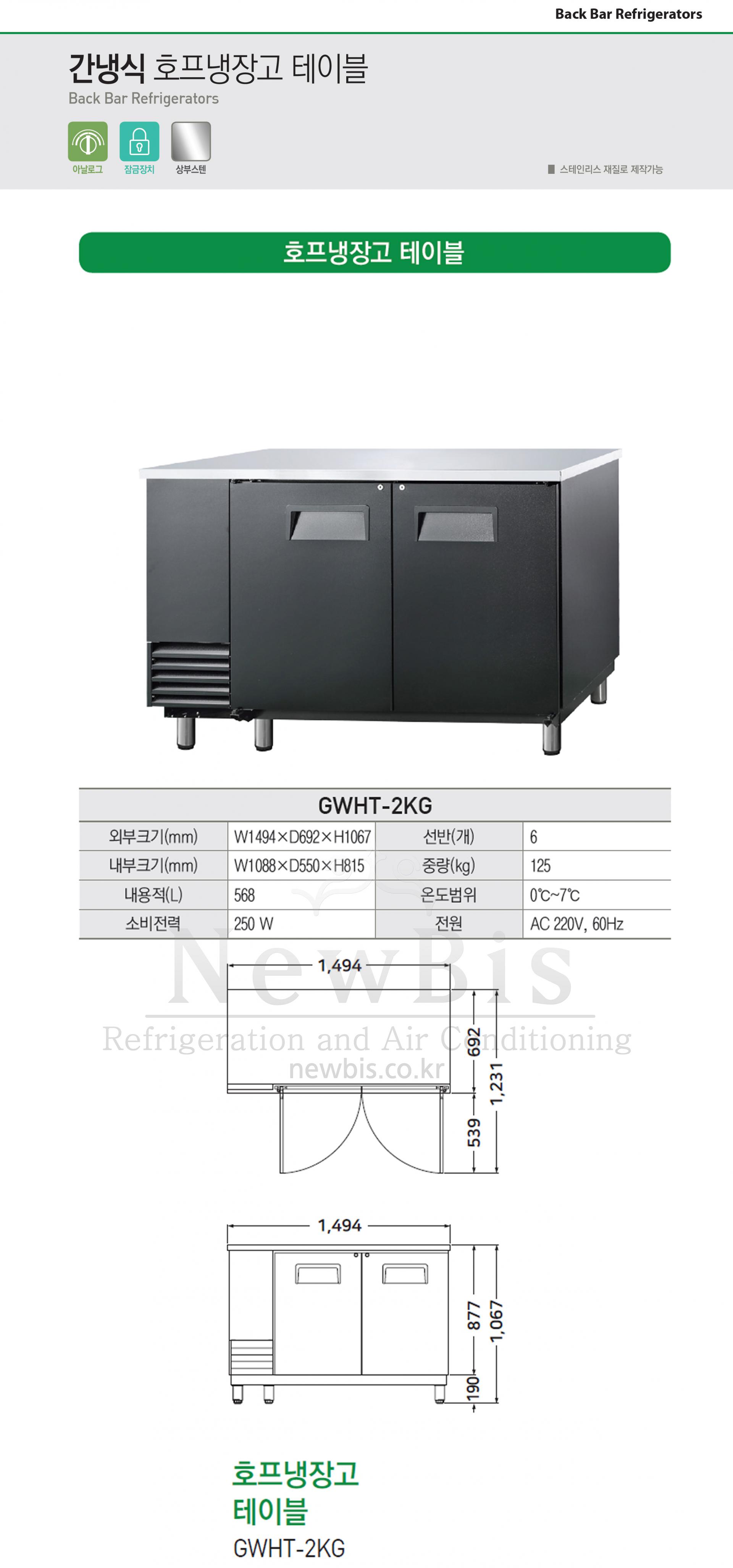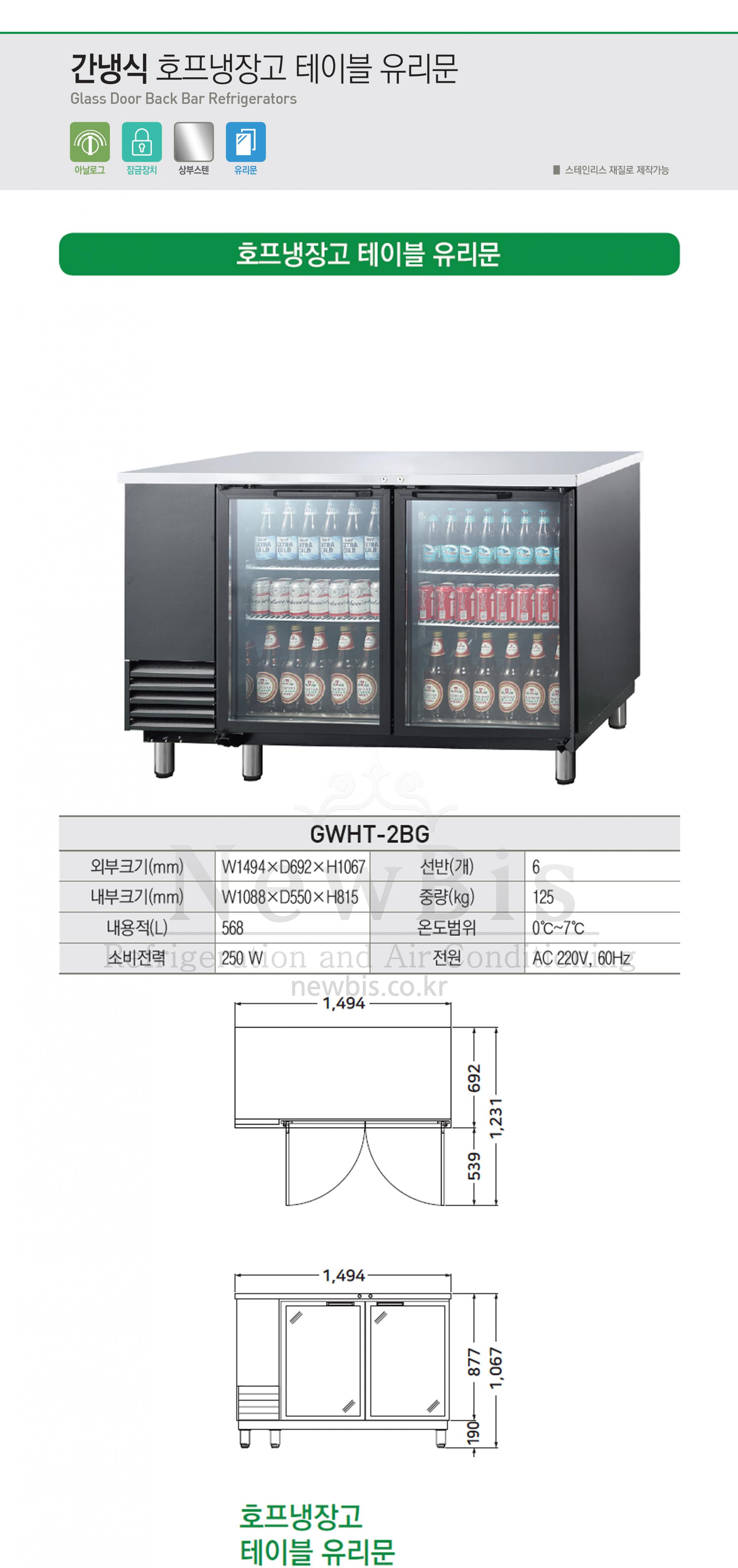 우성 호프냉장고 간냉식 테이블 유리문형 2도어 GWHT-2BG 1494*692*1067SALE