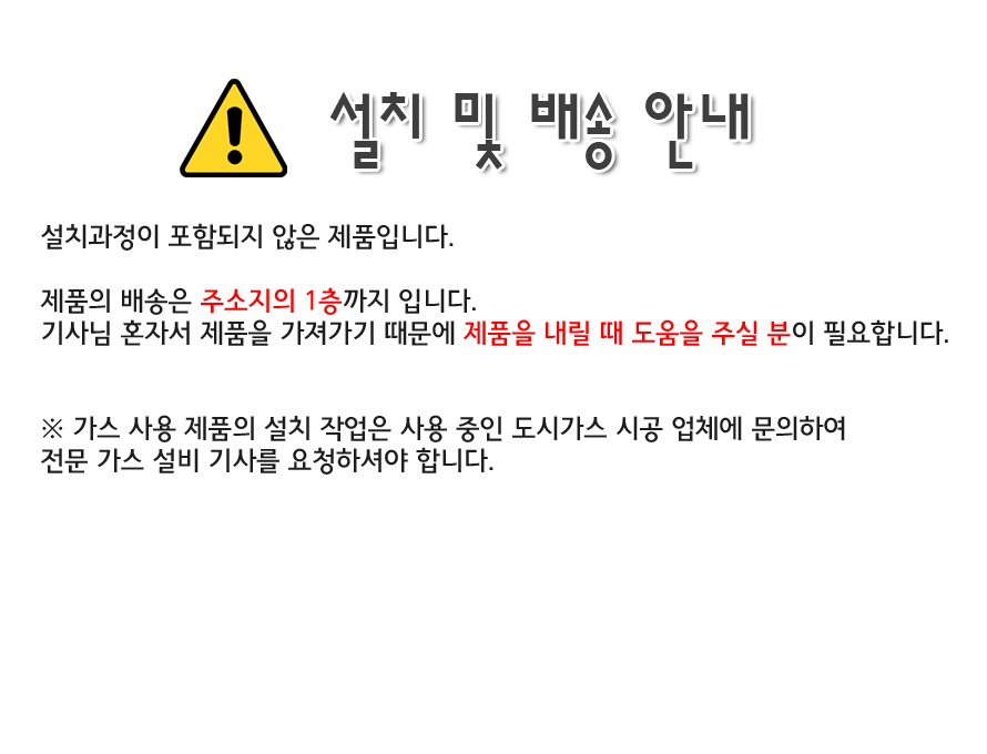 ※ 가스 사용 제품의 설치 작업은 사용 중인 도시가스 시공 업체에 별도로 연락하여 전문 가스 설비 기사를 요청하셔야합니다.