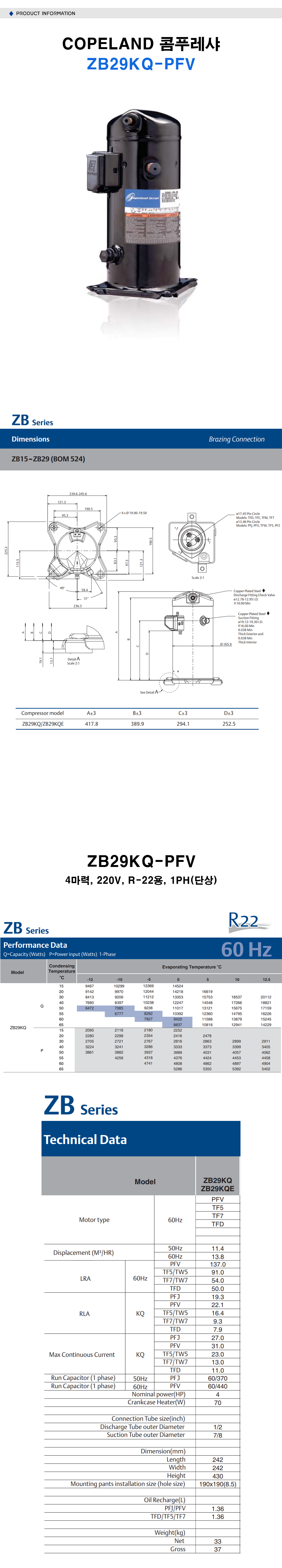 [COPELAND] 4마력 코플랜드 스크롤 콤프레셔 ZB29KQ-PFV