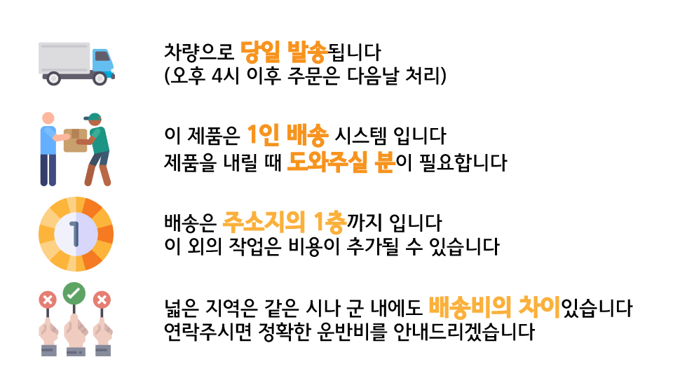 - 전문기사 설치가 필요한 제품은 설치 배송이 진행되며, 배송 전 반드시 주소지/진입조건 확인이 필요합니다.