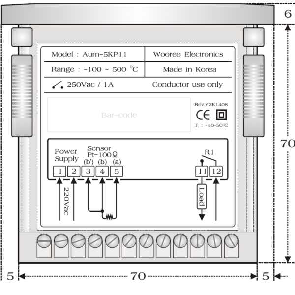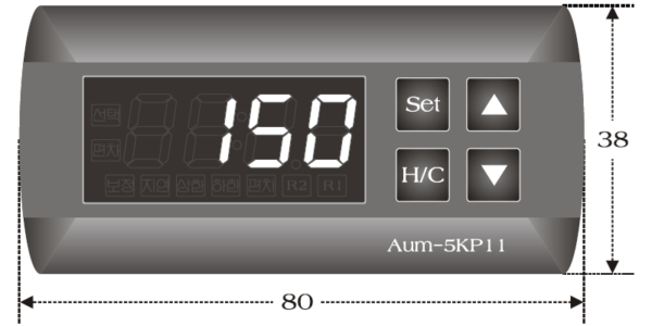| 기능 | 히팅/쿨링 제어 모드 선택 센서 온도 보정 기능 출력 지연 기능 상한/하한 온도 설정 및 알람 표시 센서 이상시 자기 진단 기능 프로그램 잠금(Lock) 기능 섭씨/화씨 표시 선택 |