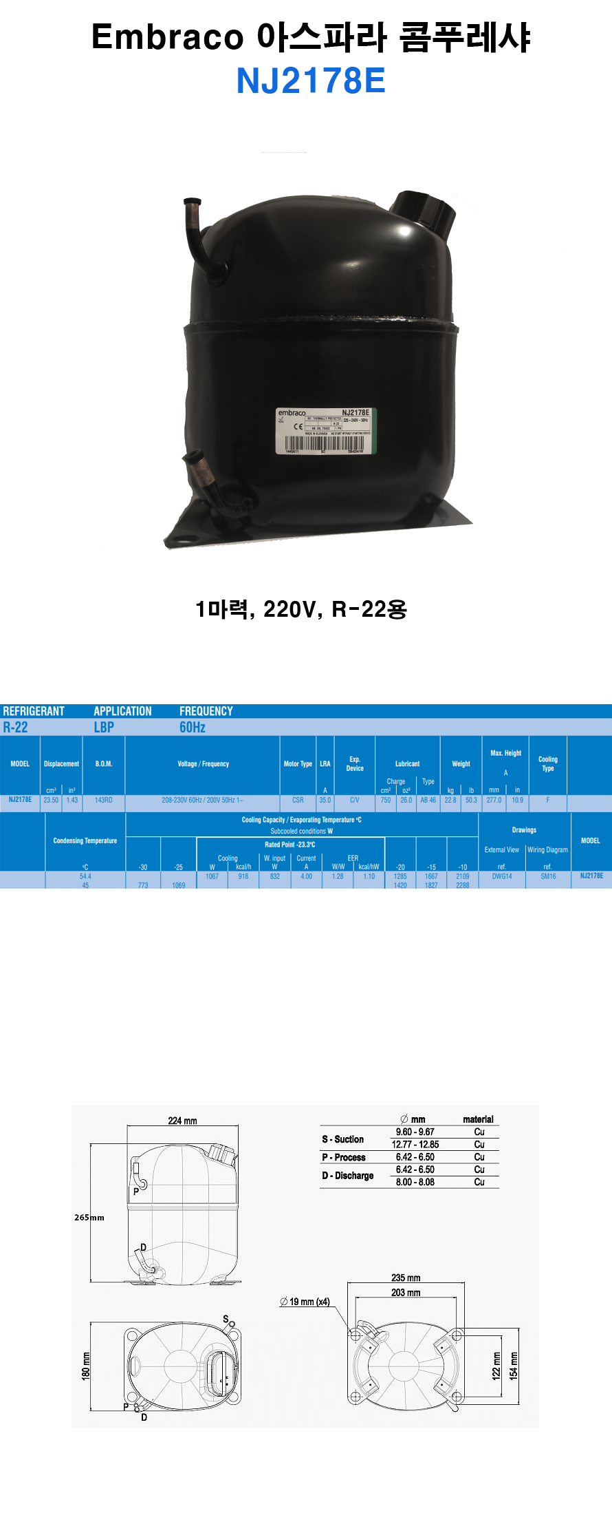 [EMBRACO] 1마력 아스파라 콤프레셔 NJ2178E (ASPERA)