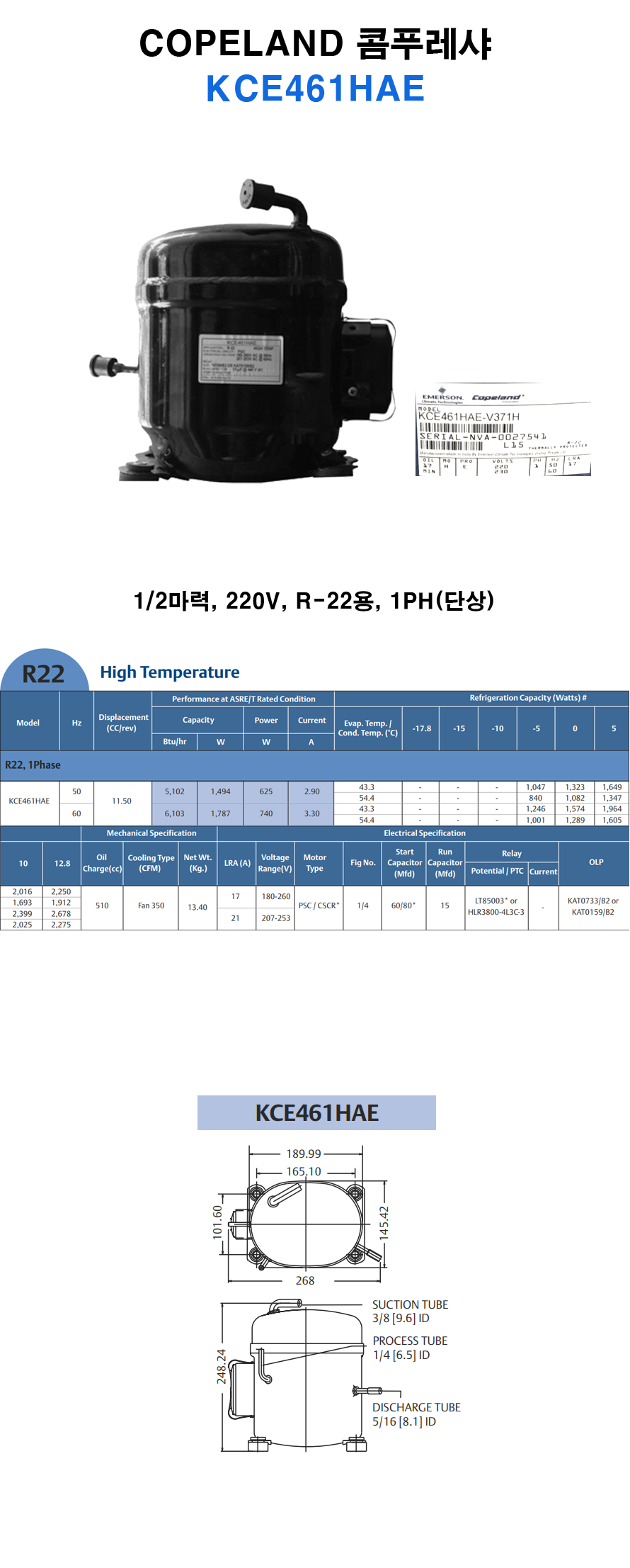 [COPELAND] 1/2마력 코플랜드 콤프레셔 KCE461HAE