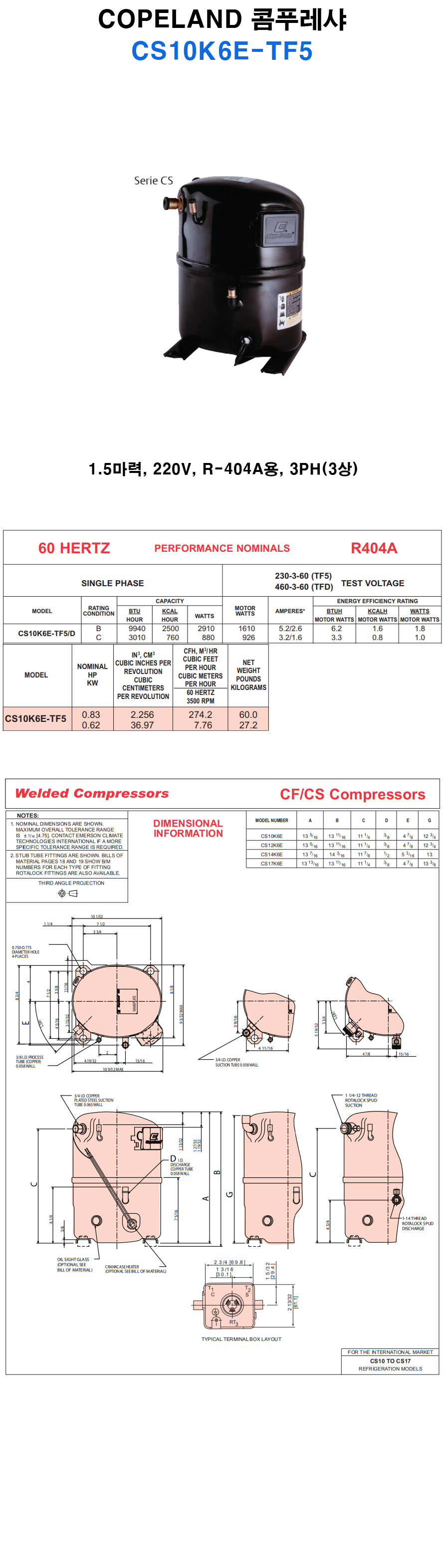 [COPELAND] 1.5마력 코플랜드 콤프레셔 CS10K6E-TF5