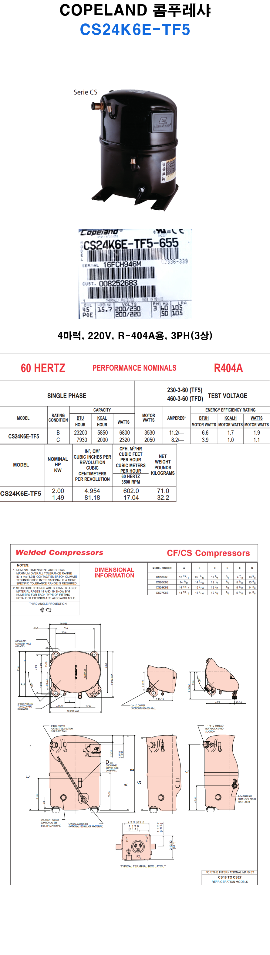 [COPELAND] 4마력 코플랜드 콤프레셔 CS24K6E-TF5