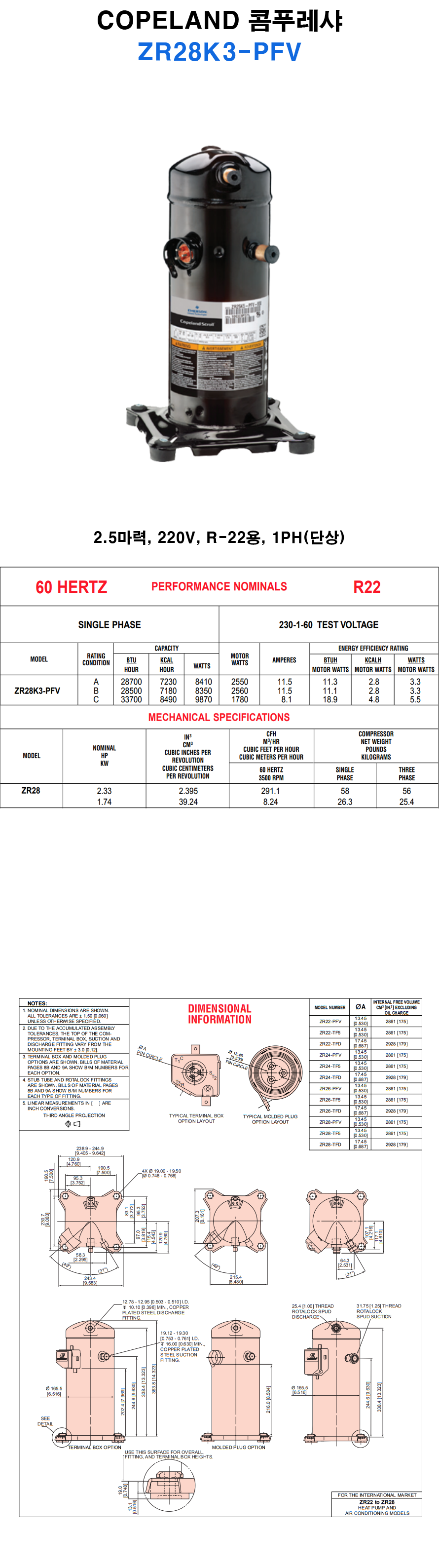 [COPELAND] 2.5마력 코플랜드 스크롤 콤프레셔 ZR28K3-PFV