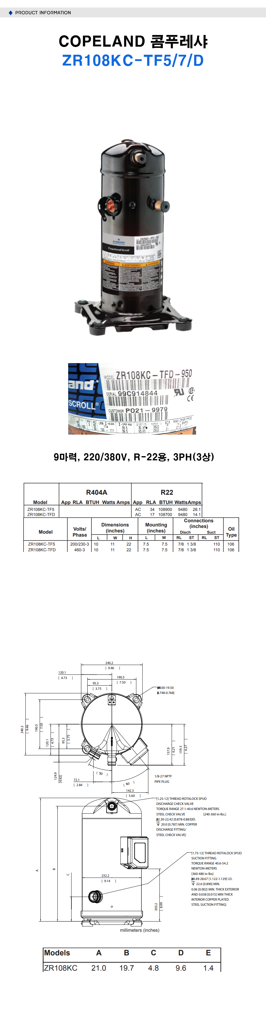 [COPELAND] 9마력 코플랜드 스크롤 콤프레셔 ZR108KC-TF5 / ZR108KC-TF7/ ZR108KC-TFD