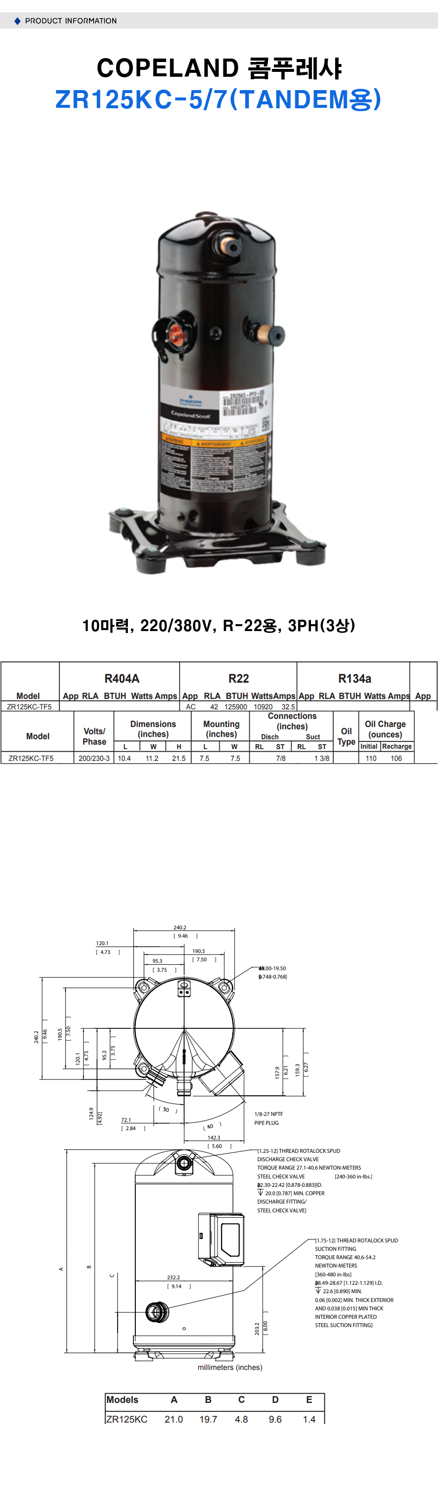 [COPELAND] 10마력 코플랜드 스크롤 TANDEM 콤프레셔 ZR125KC-5 / ZR125KC-7