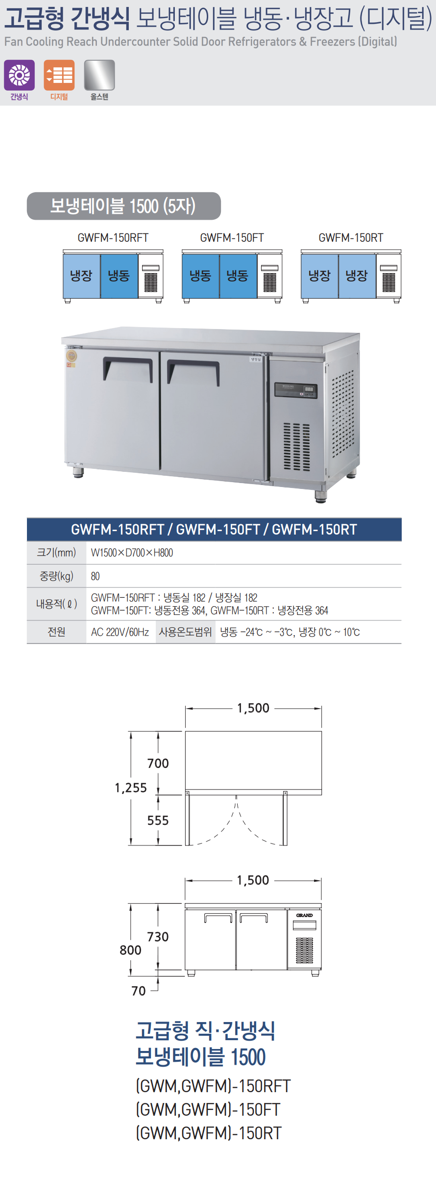 우성 고급형 간냉식 5자(1500) 보냉테이블 냉장고 올냉장 GWFM-150RT GWFM-150FT GWFM-150RFT
