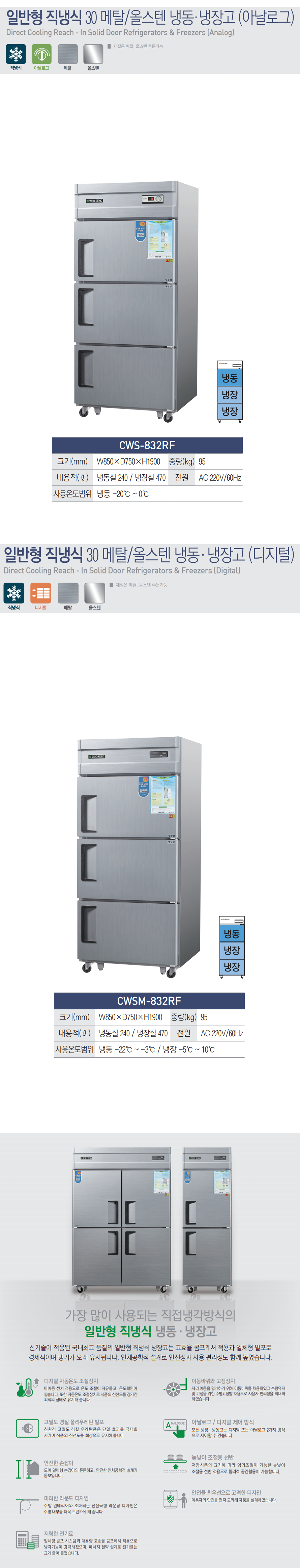 우성 30박스 업소용 냉장고 직냉식 3도어 CWS-832RF CWSM-832RF