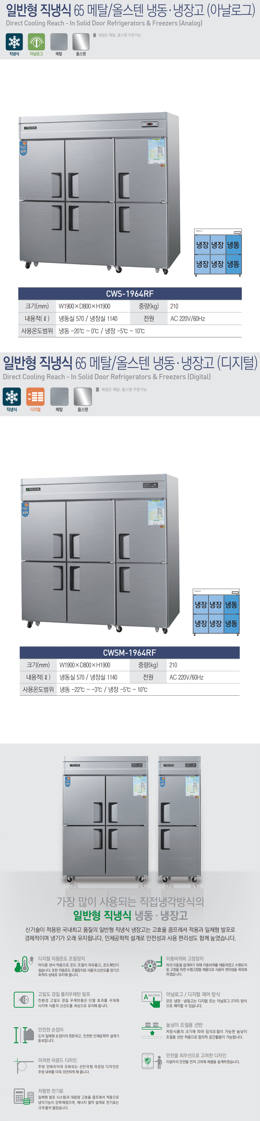 [우성] 일반형 직냉식 냉장고 65박스 1/3냉장냉동 CWS-1964RF, CWSM-1964RF 내부스텐/올스텐