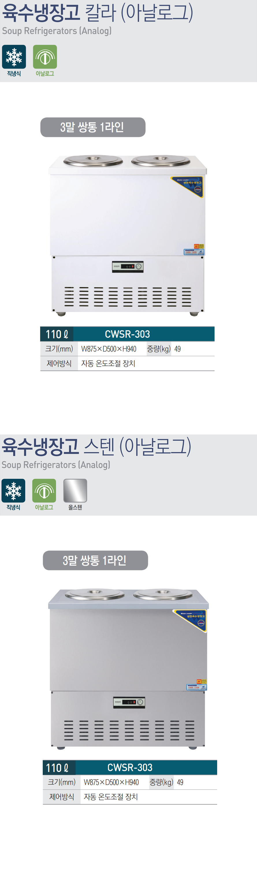 [우성] 업소용 육수냉장고 110L 쌍통형 CWSR-303 (875×500×940)