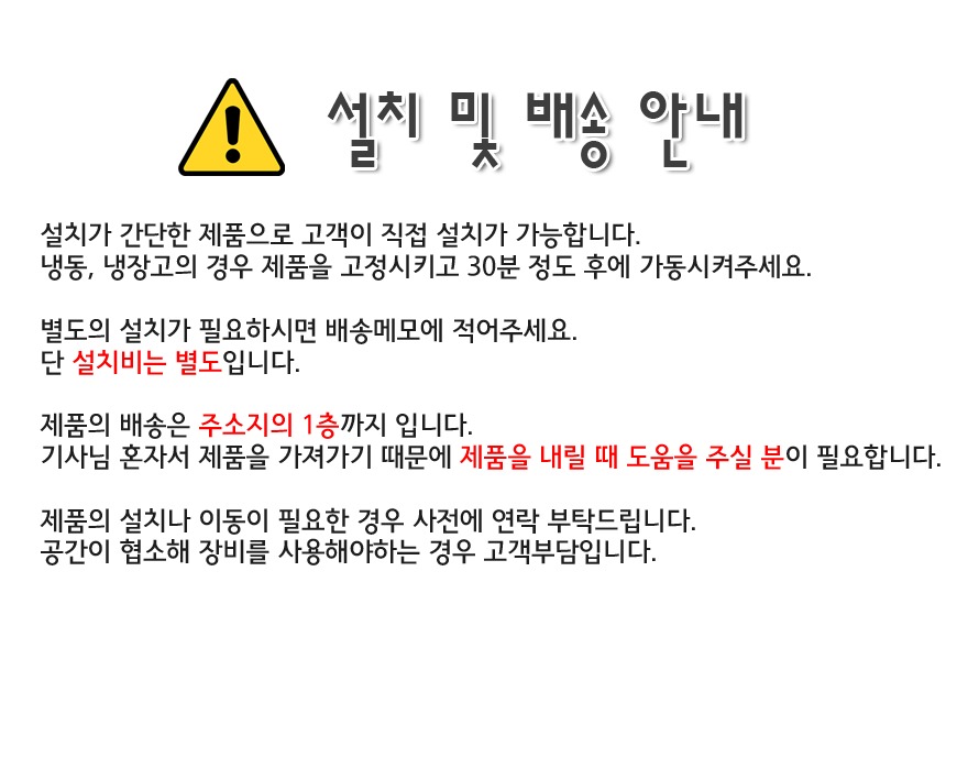 - 전문기사 설치가 필요한 제품은 설치 배송이 진행되며, 배송 전 반드시 주소지/진입조건 확인이 필요합니다.
