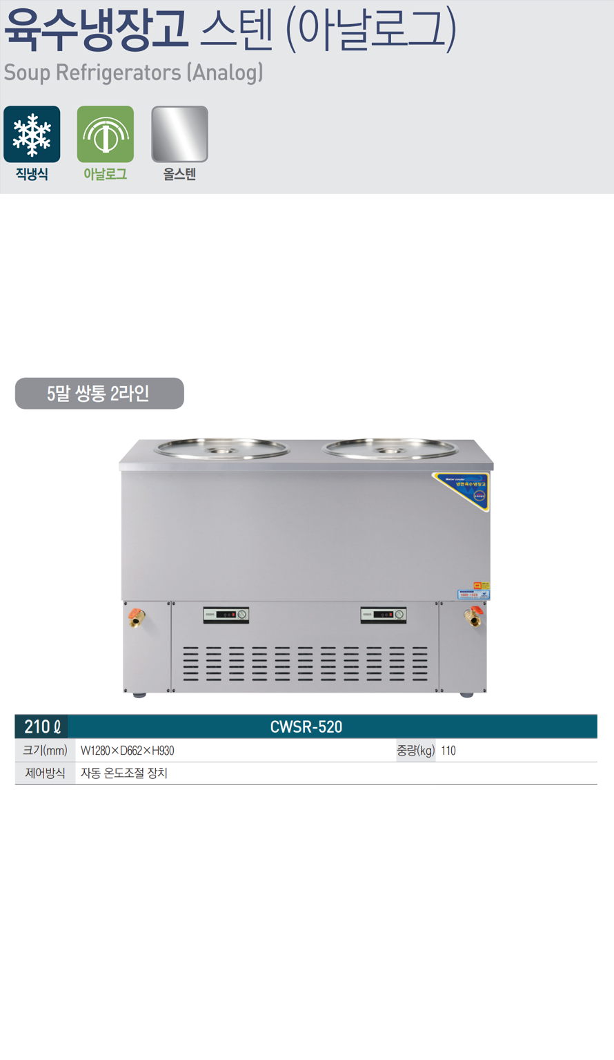 [우성] 업소용 육수냉장고 210L 쌍통형 CWSR-520 (1280x662x930)