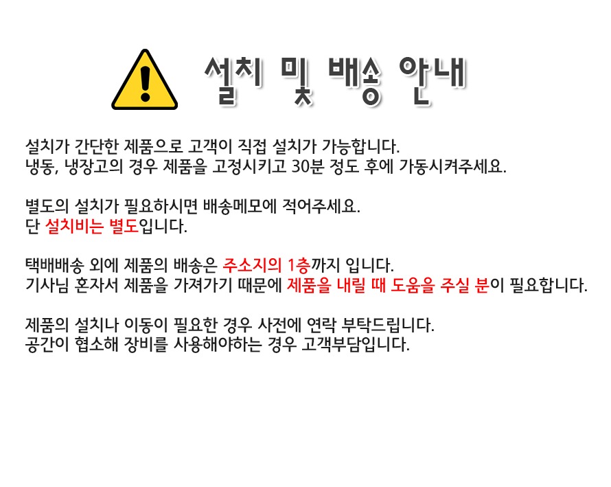 - 전문기사 설치가 필요한 제품은 설치 배송이 진행되며, 배송 전 반드시 주소지/진입조건 확인이 필요합니다.