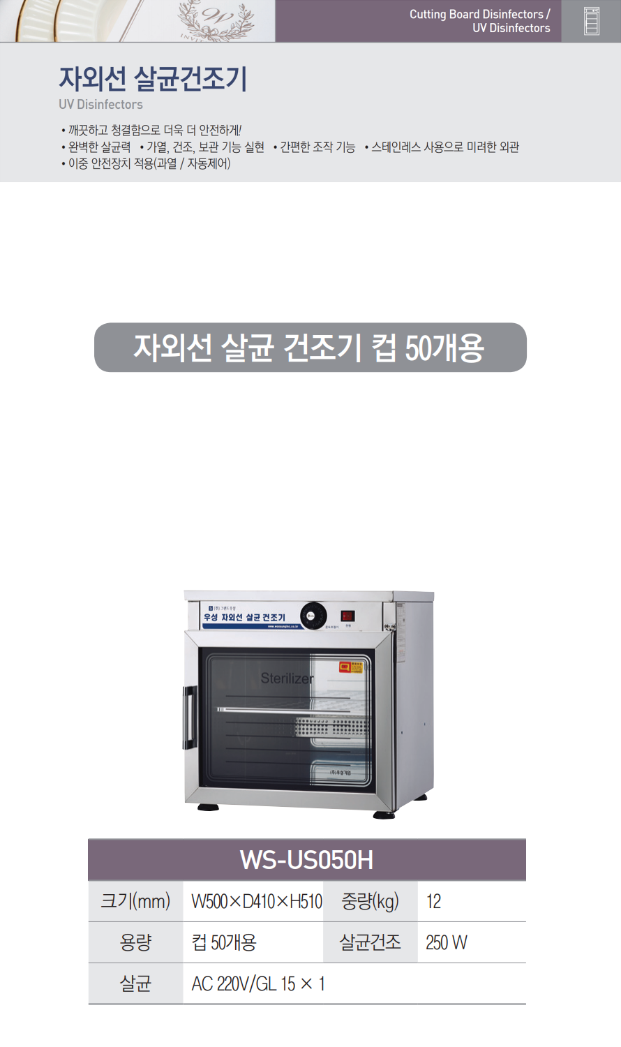 우성 WS-US050H 업소용 컵 소독기 – 자외선 살균, 건조기, 50개용, 이중 안전장치SALE