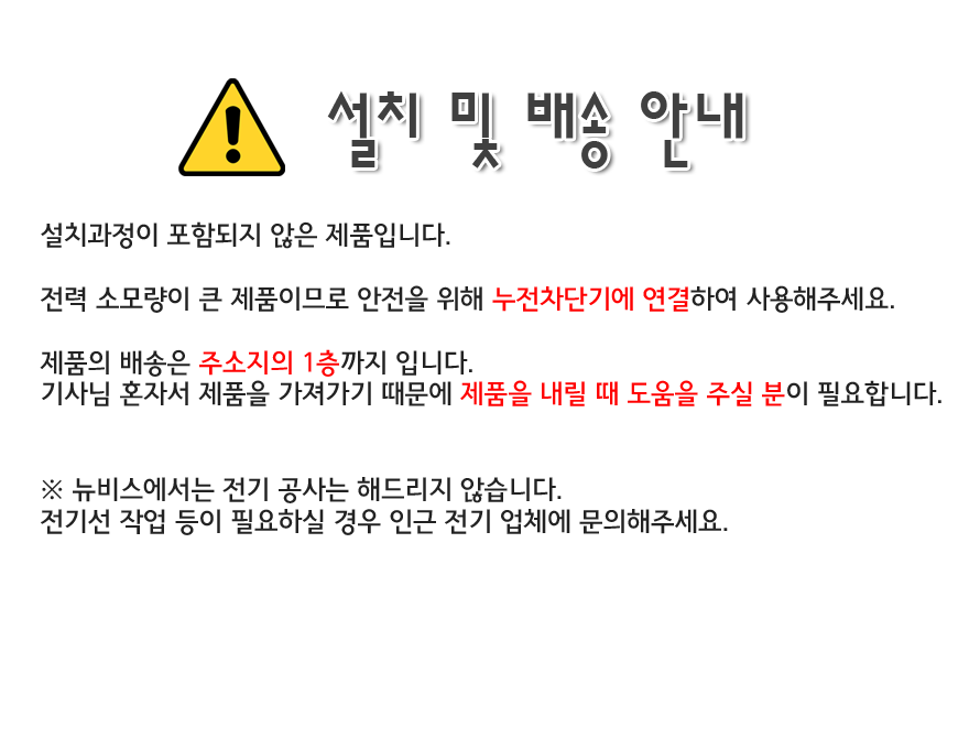 - 전문기사 설치가 필요한 제품은 설치 배송이 진행되며, 배송 전 반드시 주소지/진입조건 확인이 필요합니다.
